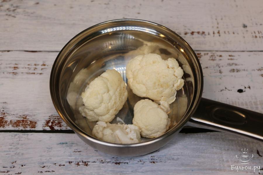 3. Соцветия цветной капусты отварите в кипящей воде 7 минут. Затем нарежьте на небольшие соцветия и обжарьте на сковороде с растительным маслом.