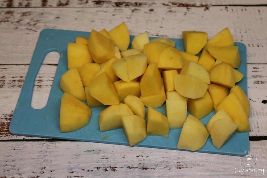 2. Картофель используйте некрупный, очистите его, разрежьте каждый клубень на 8 частей. В начале поделите его напополам, затем каждую половинку на 4 части, разрезав половинку в начале вдоль, потом поперек. Если картофель крупнее, то делите на большее количество частей
