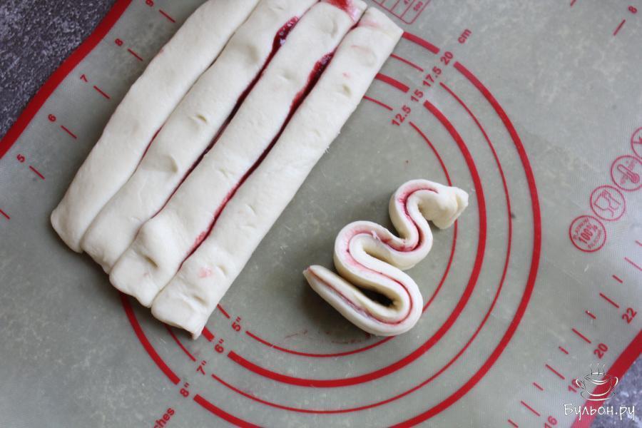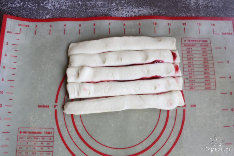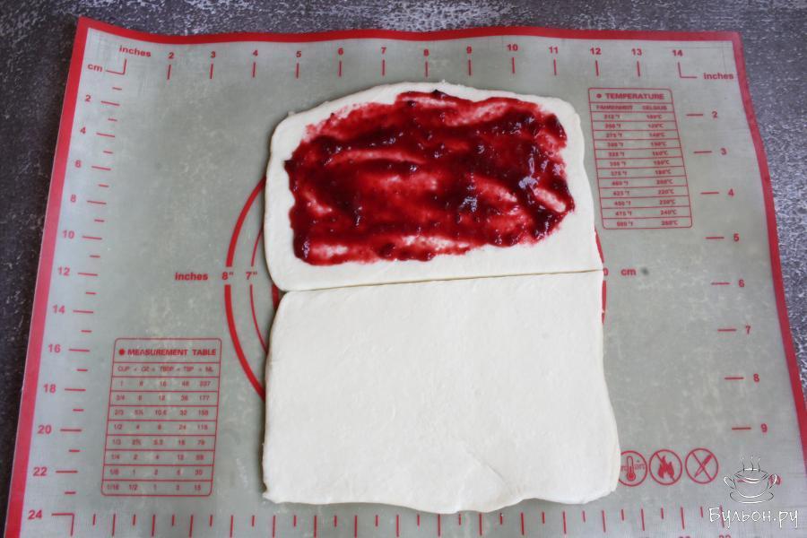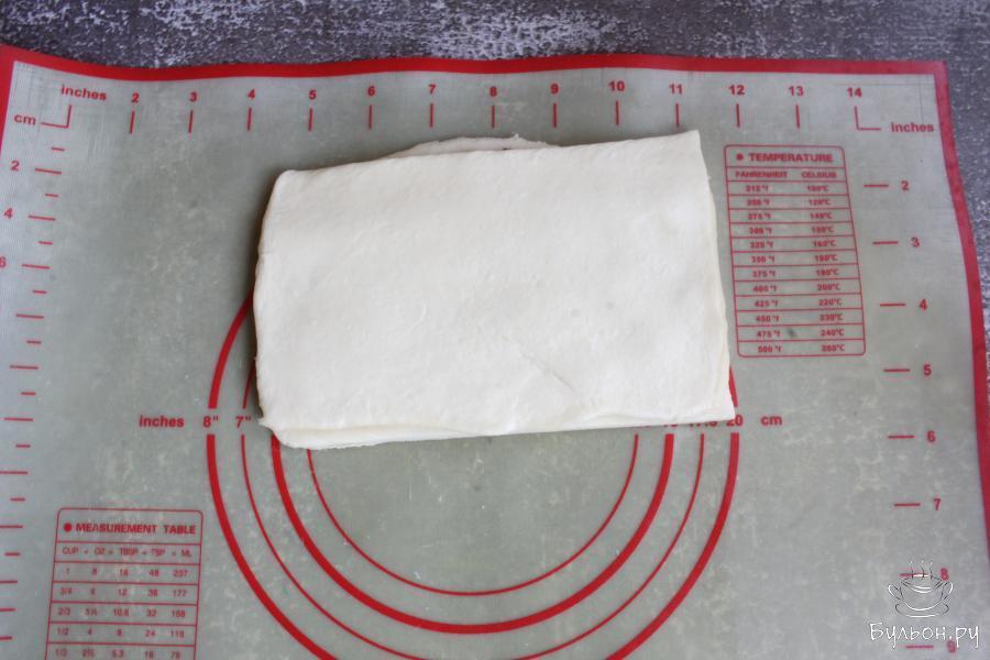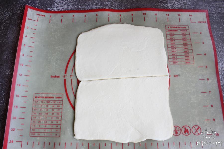 1. Тесто разморозить. Раскатать тесто не очень тонко в прямоугольный пласт. Раскатывать в одну сторону, чтобы не нарушить слои. Разрезать тесто на две равные половины.
