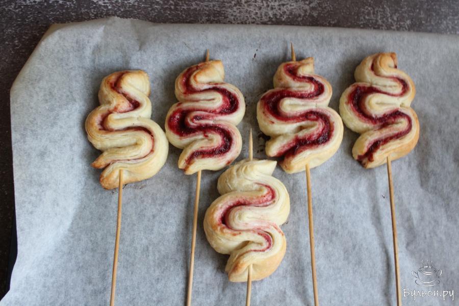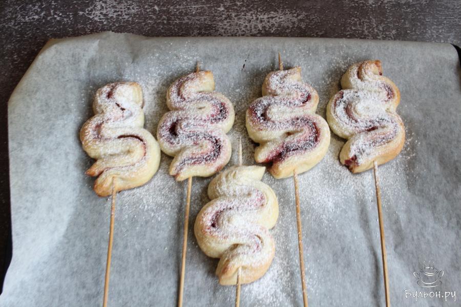 6. Аккуратно нанизать слойки на шпажки. Тесто сильно не уплотнять на шпажках, чтобы было место для увеличения слоек во время выпечки. Выложить елочки на противень.