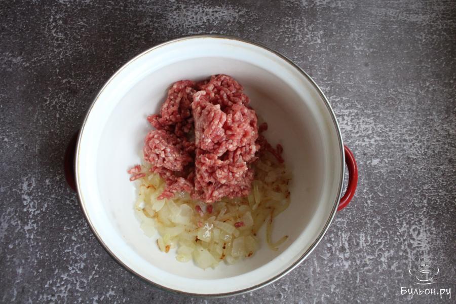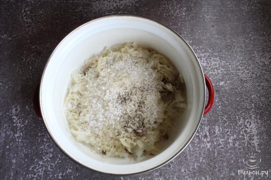 4. Добавить в кастрюлю воду, рис, соль и перец по вкусу. Перемешать. Накрыть крышкой и тушить капусту 25-30 минут.