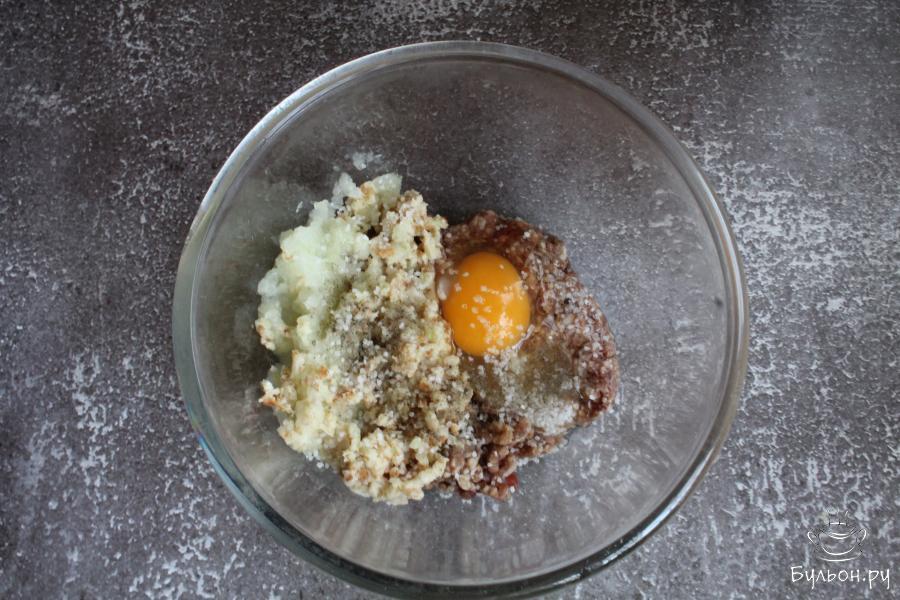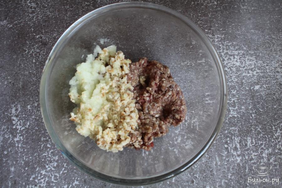 1. Фарш выложить в чашку. В фарш перекрутить через мясорубку мягкий хлеб и очищенную луковицу среднего размера.
