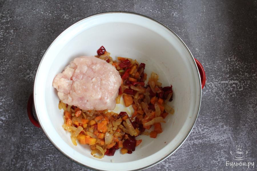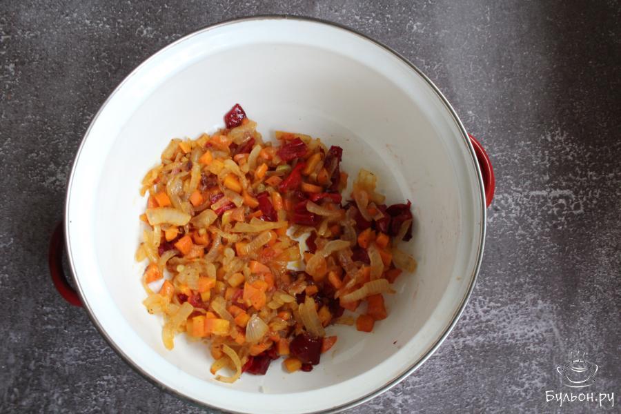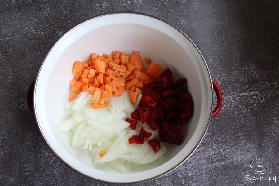 1. Овощи почистить и промыть. Нарезать лук, красный болгарский перец и морковь мелкими кубиками. В удобную посуду налить масло, разогреть и выложить овощи.