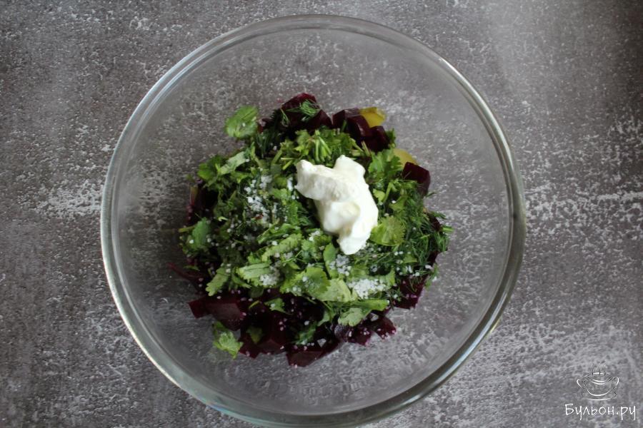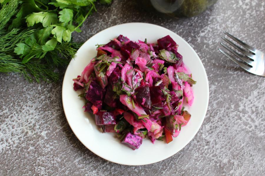Легкий салат из вареной свеклы и квашеной капусты порадует всех любителей свекольных салатов. Салат получается яркий, сочный, полезный, вкусный и бодрящий. Для его приготовления можно взять самую кислую квашеную капусту. Салат готовится очень просто. Этот салат можно приготовить для повседневного стола. Еще он подходит и для вегетарианского меню. Зелень для приготовления салата берите свою любимую, а сметану желательно взять пресную, без сильной кислинки.