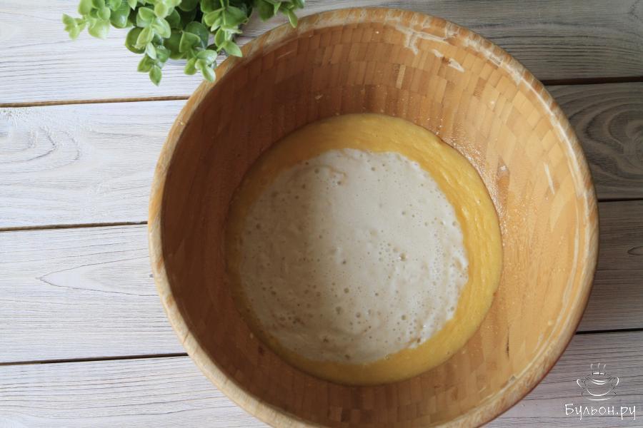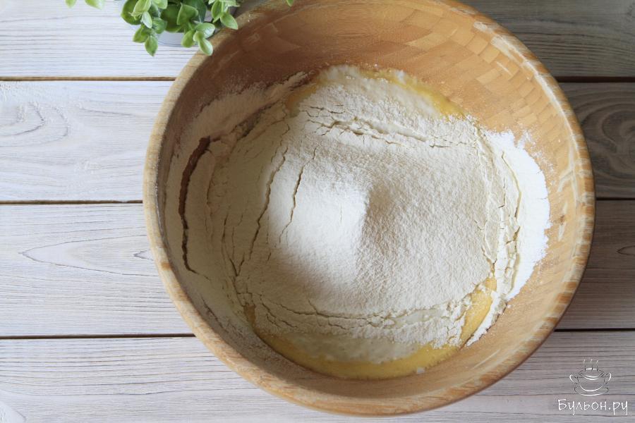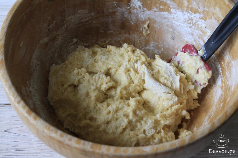 11. Массу выложить на рабочую поверхность и замесить тесто постепенно добавляя остатки муки. Чтобы тесто не прилипало к рукам в процессе вымешивания, смазать их растительным маслом. Вымешивать тесто не менее 5-7 минут.
