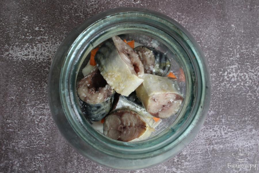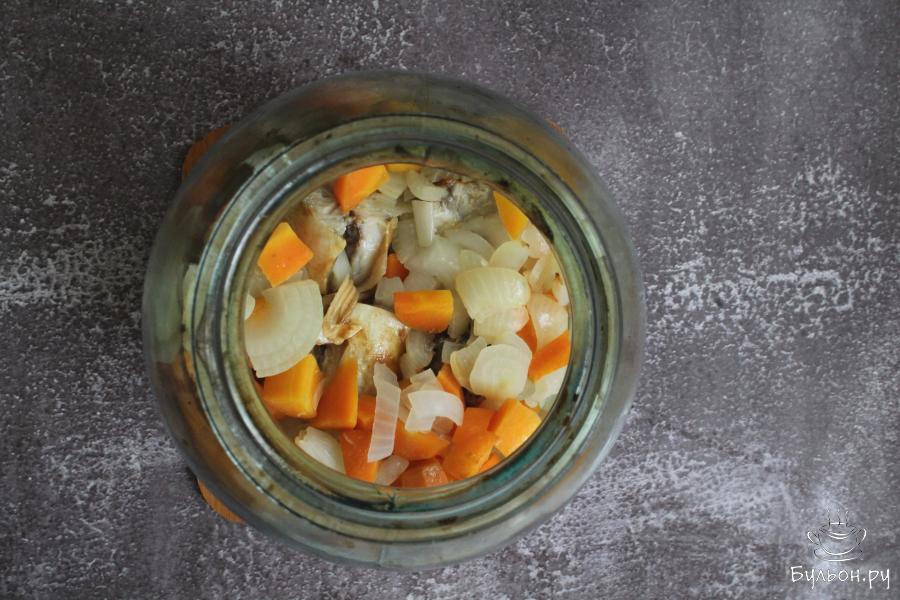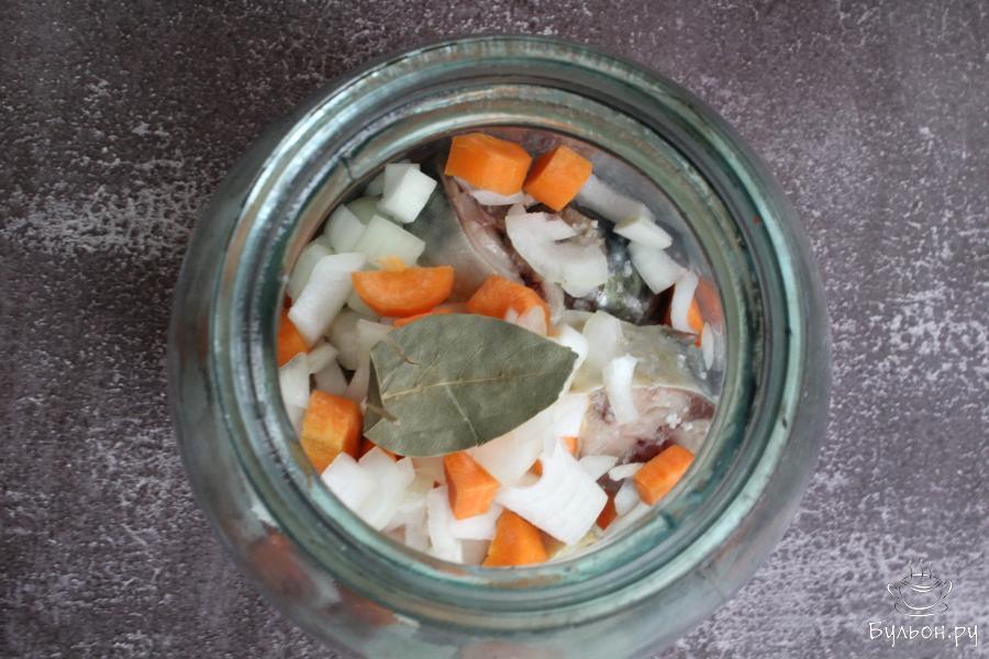 5. Чередовать так слоями, овощи, рыба, пока ингредиенты не закончатся. Налить масло и выложить лавровый лист в банку.