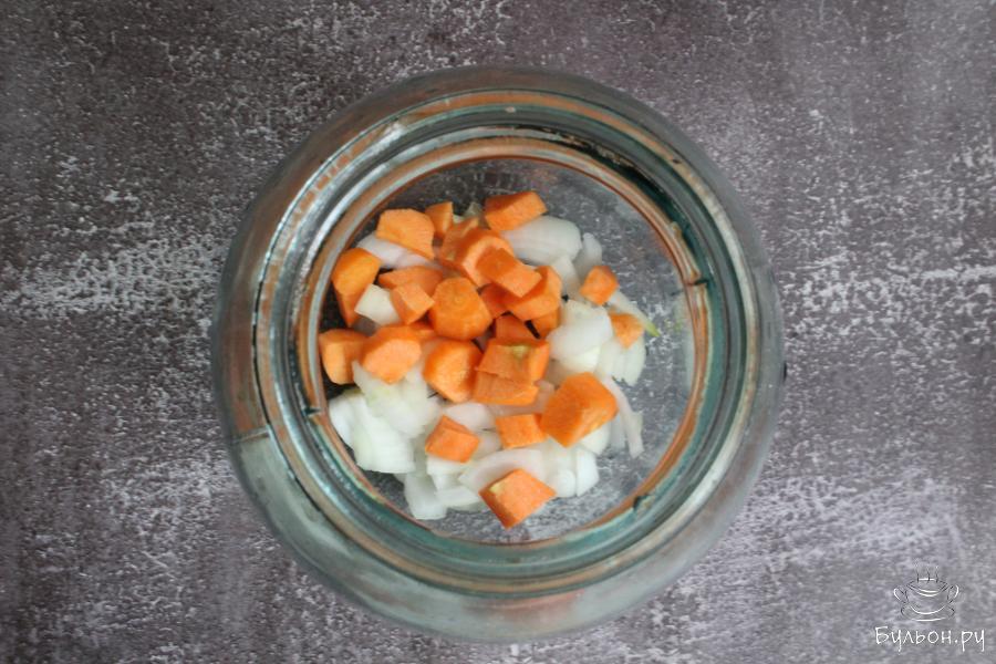 3. Лук и морковь почистить, промыть. Лук нарезать не очень мелко, морковь тоже не очень мелкими кубиками. Выложить часть овощей в банку.