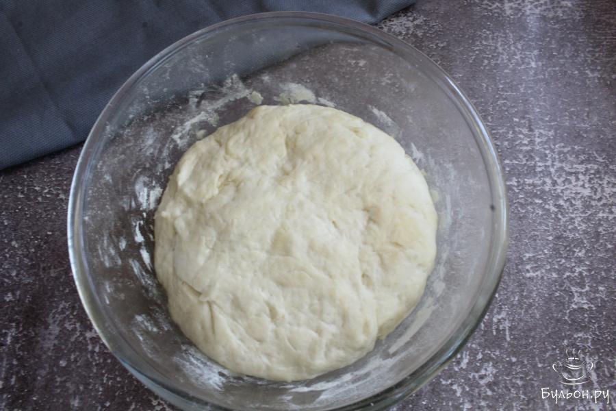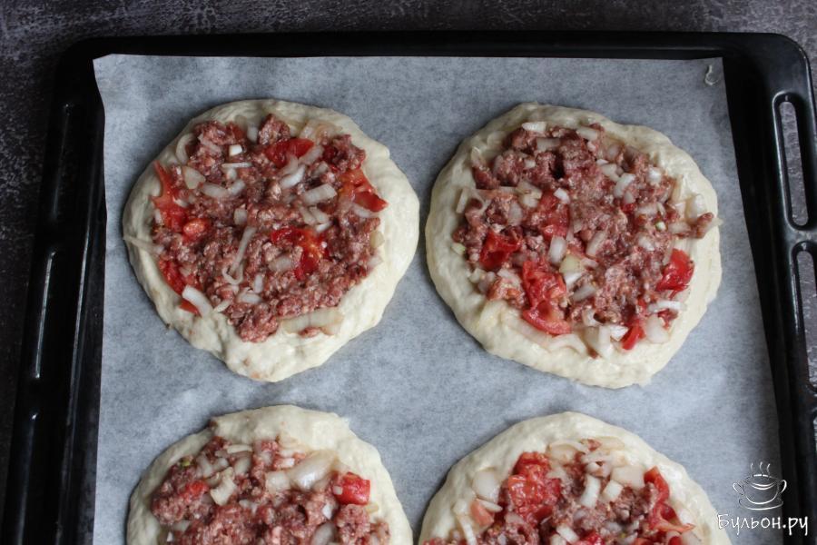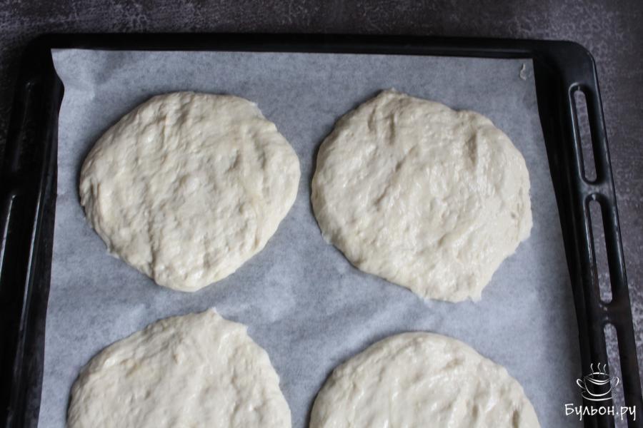 8. Тесто обмять и разделить на 4 или более частей. Руками сформировать лепешки, толщиной около 1 см. Выложить лепешки на противень.