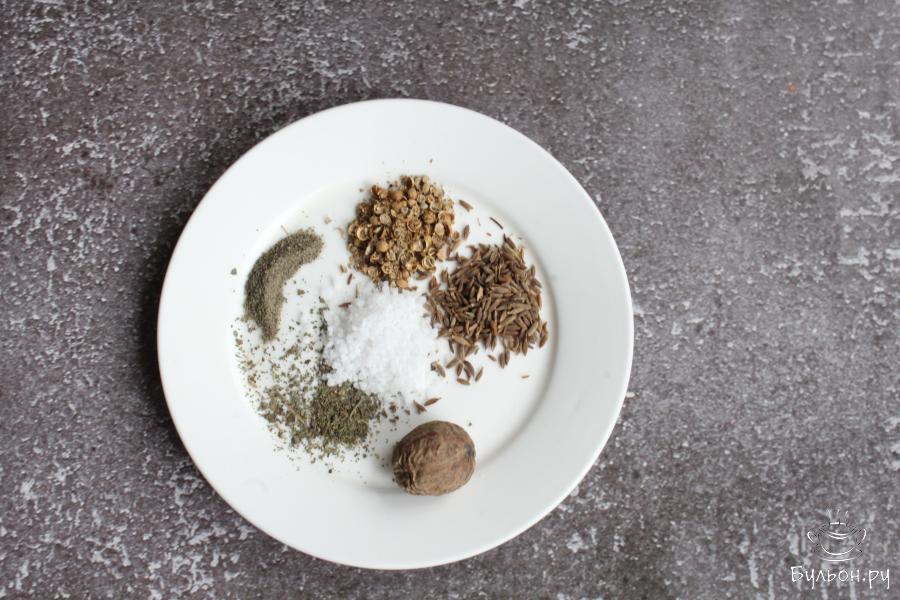 7. Подготовить черный перец, зиру, тимьян, кориандр, мускатный орех, соль. Добавить в фарш пряности и оливковое масло, перемешать.