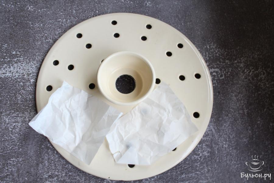 6. На листы мантоварки выложить бумагу для выпечки. Поставить мантоварку с водой на плиту, чтобы вода закипела.