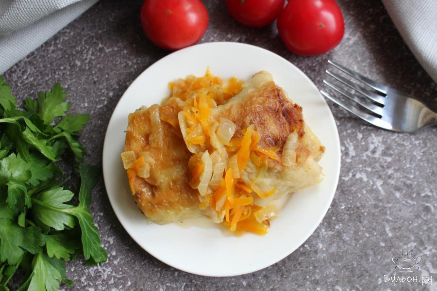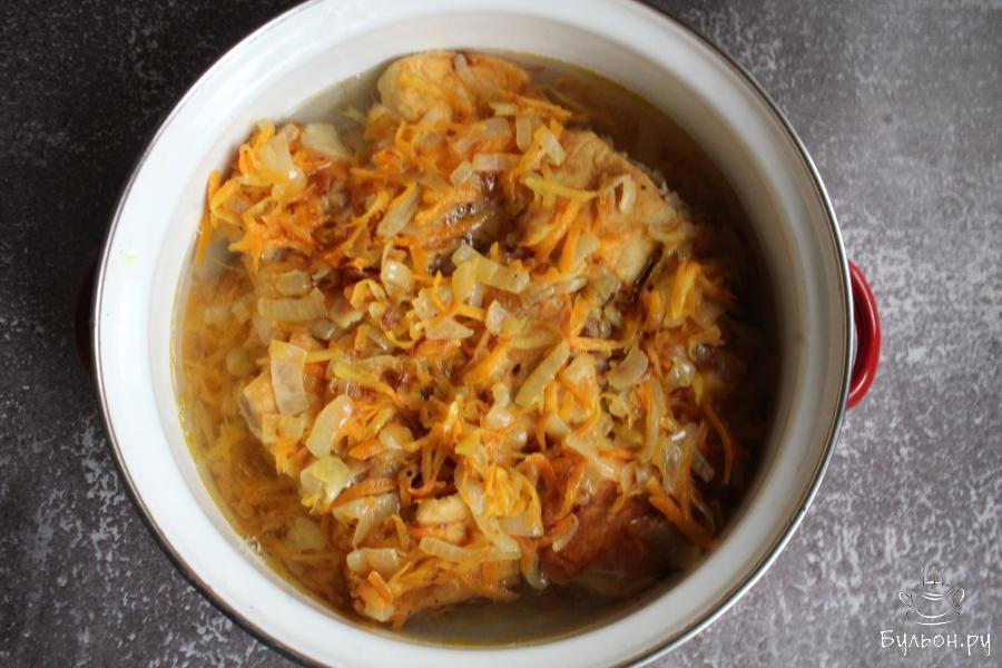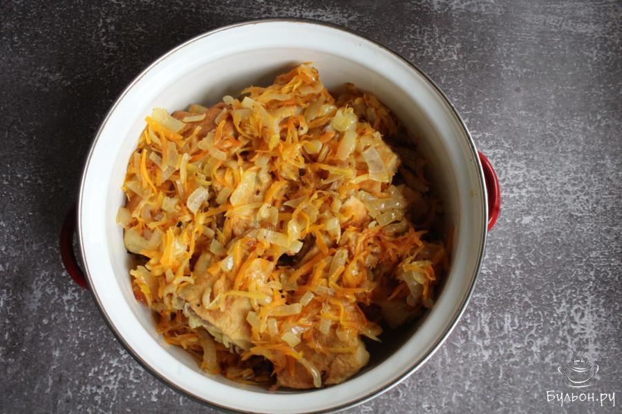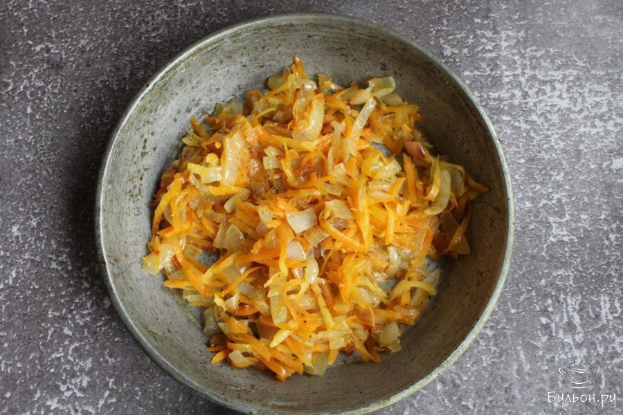 5. Лук и морковь почистить, промыть. Лук нарезать мелко, морковь натереть на крупной терке. Тушить овощи до мягкости на сковороде с 2 ст. л. растительного масла.