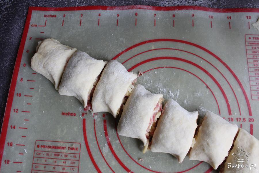 6. Тесто раскатать в тонкий пласт. Для удобства работы можно разделить тесто на несколько частей. Выложить на тесто начинку, раскладывать начинку не густо.