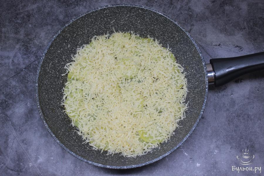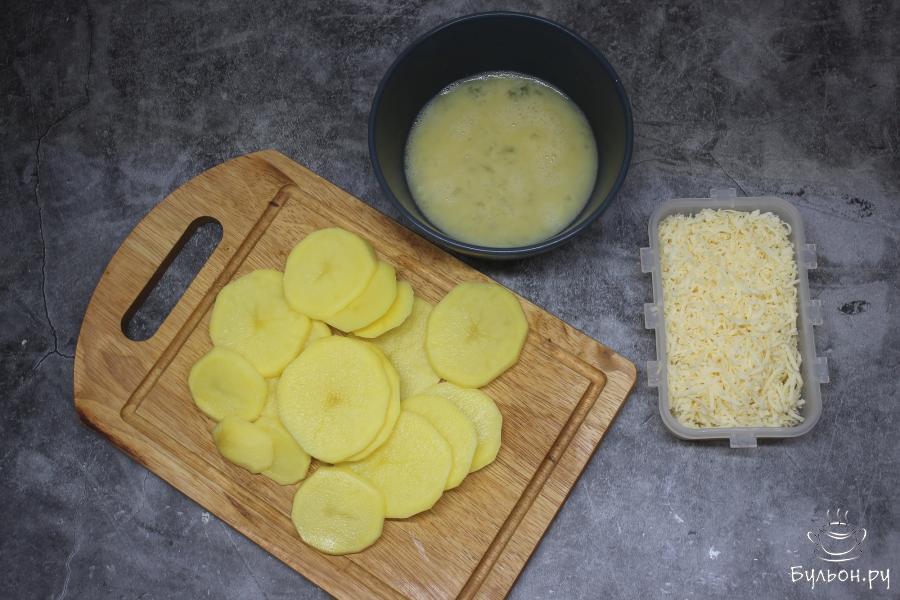 1. В миске, с помощью вилки, взбейте яйца с солью. По желанию, можно добавить свои любимые специи. Очищенный картофель тонко нарежьте на слайсы. Чем тоньше будет нарезка, тем быстрее приготовится омлет. Сыр натрите на терке.