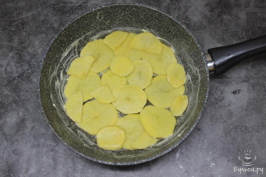 2. Сковороду смажьте сливочным маслом, затем выложите ломтики картофеля, закройте сковороду крышкой и поставьте ее на средней огонь. Готовьте 10 минут, после разогрева сковороды.