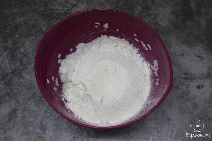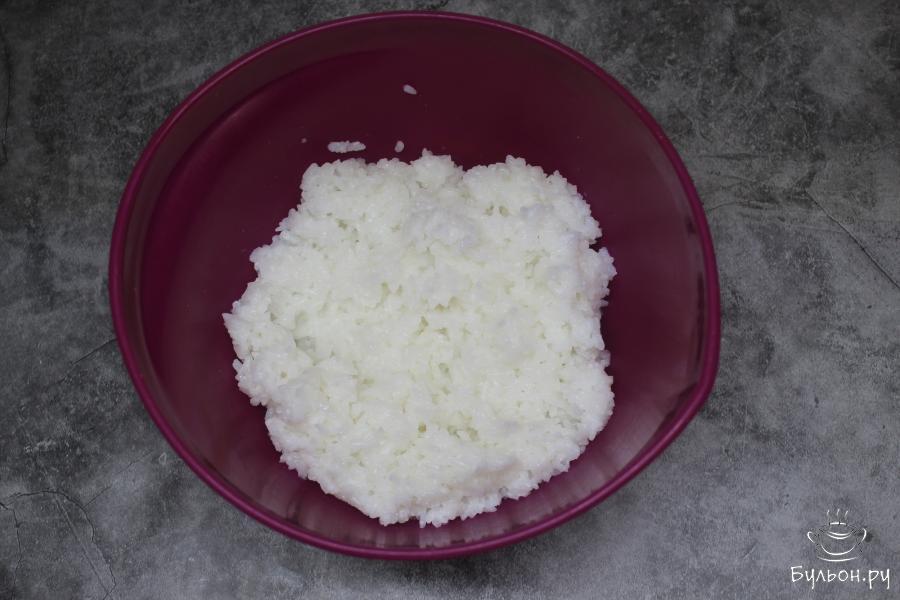 1. Рис залейте водой и отварите до полной готовности. Готовый рис переложите в емкость для замеса теста и отставьте в сторону на 15 минут.