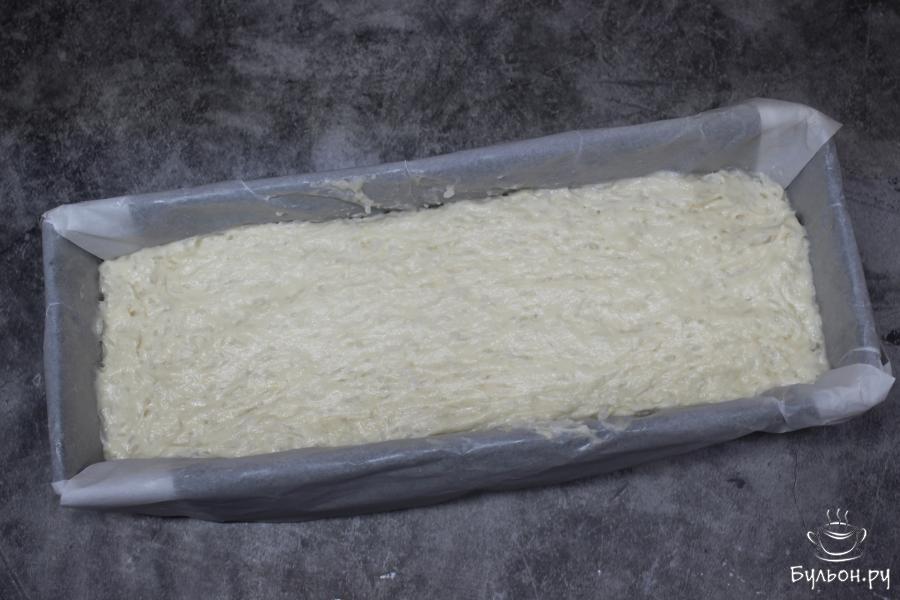 4. Форму для запекания хлеба застелите пергаментом. Чтобы тесто было легче извлечь из миски, смажьте свои руки небольшим количеством растительного масла, выложите тесто в форму и оставьте на расстойку, на 15 минут. Затем поставьте форму с тестом в разогретую до 180 градусов духовку, на 1 час.