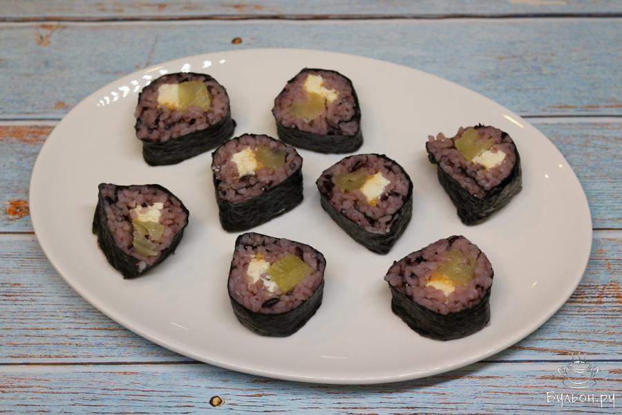 Ролл с ананасом и сыром не только выглядит очень интересно, но и на вкус он нестандартный, поскольку в начинке сыр с манго и ананас. Сыр можно использовать классический сливочный. Роллы получаются одновременно соленоватыми - из-за нори и риса, сладковатыми - из-за консервированного ананаса и стружки манго. Для любителей классики могут не подойти, но тем кто любит ананас или эксперименты, обязательно приглядитесь к этому рецепту.