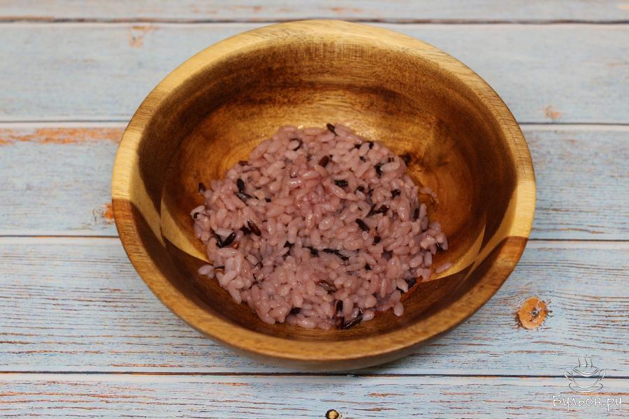 3. В кастрюлю всыпьте белый рис, добавьте черный рис, залейте водой, добавьте соль. Закройте крышкой, доведите до кипения, убавьте огонь до минимального. Варите рис в течение 12-15 минут. В деревянной миске смешайте рис с теплой заправкой, сверху положите мокрое полотенце, остудите крупу.
