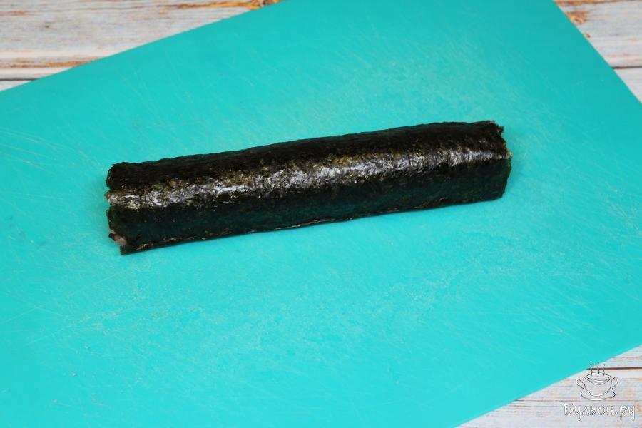 7. Круглый ролл разрежьте на 8 одинаковых частей. Нарезанные роллы выложите на блюдо и подайте к столу.