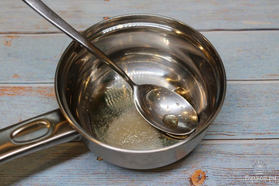 2. В ковш влейте уксус и всыпьте соль с сахаром. Растворите сыпучие составляющие на слабом огне, до их полного растворения.
