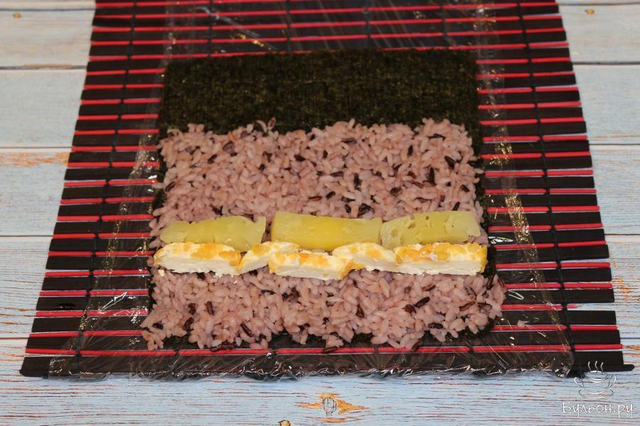 4. Возьмите циновку и оберните ее в пленку со всех сторон. На циновку выложите лист нори, на нори выложите рис. Рис выкладывайте только на две трети листа.