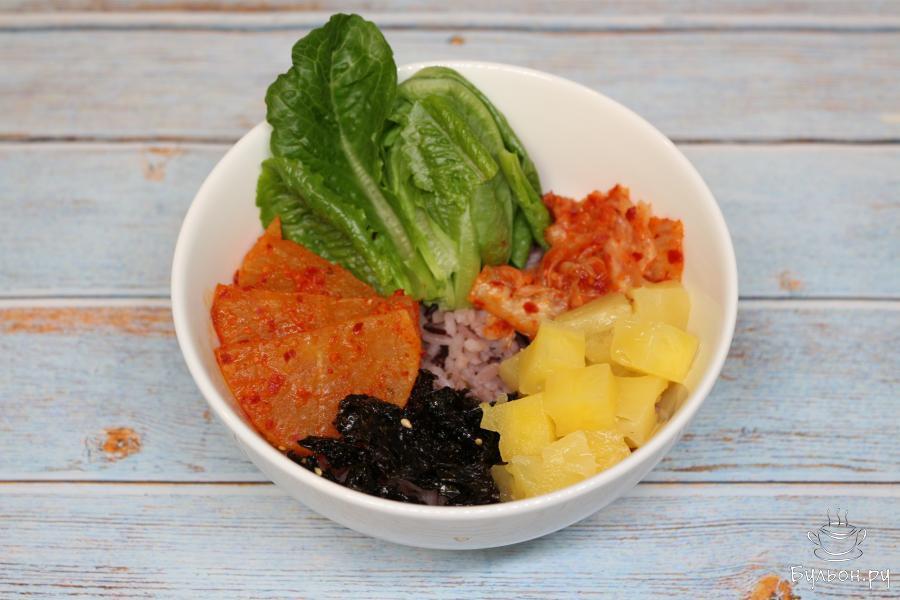7. Теперь выложите на рис остальные ингредиенты, а именно: листья романо, кимчи, маринованный дайкон, кубики ананаса и хлопья из морских водорослей. Приятного аппетита!