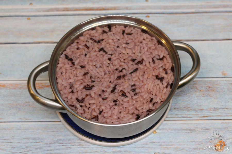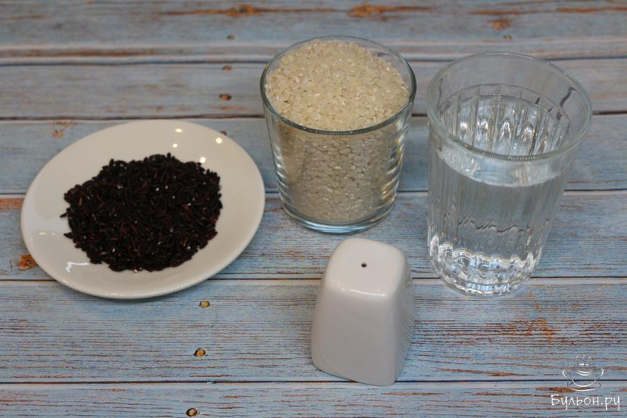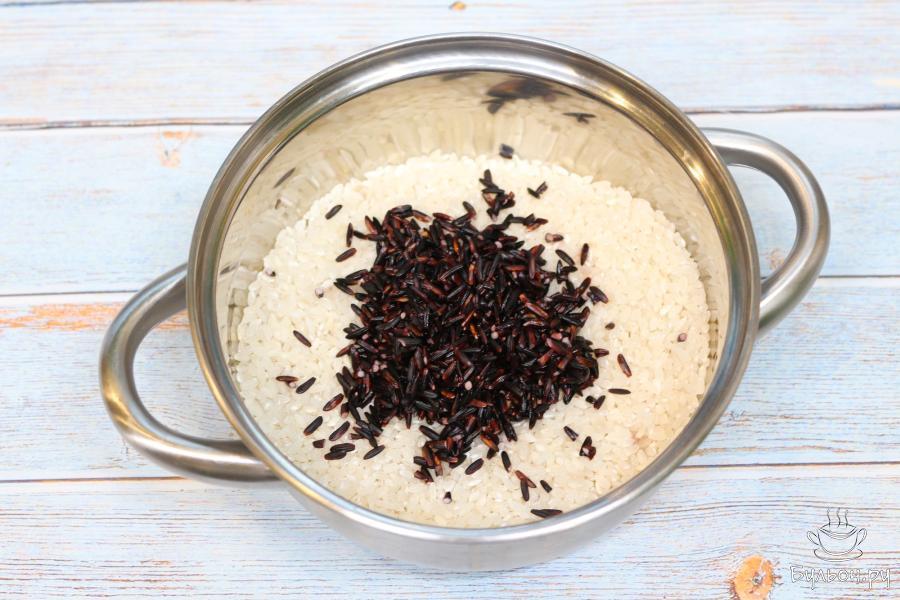3. В кастрюлю всыпьте белый рис, выложите черный, залейте водой, добавьте соль. Закройте крышкой, доведите до кипения, убавьте огонь до минимального.
