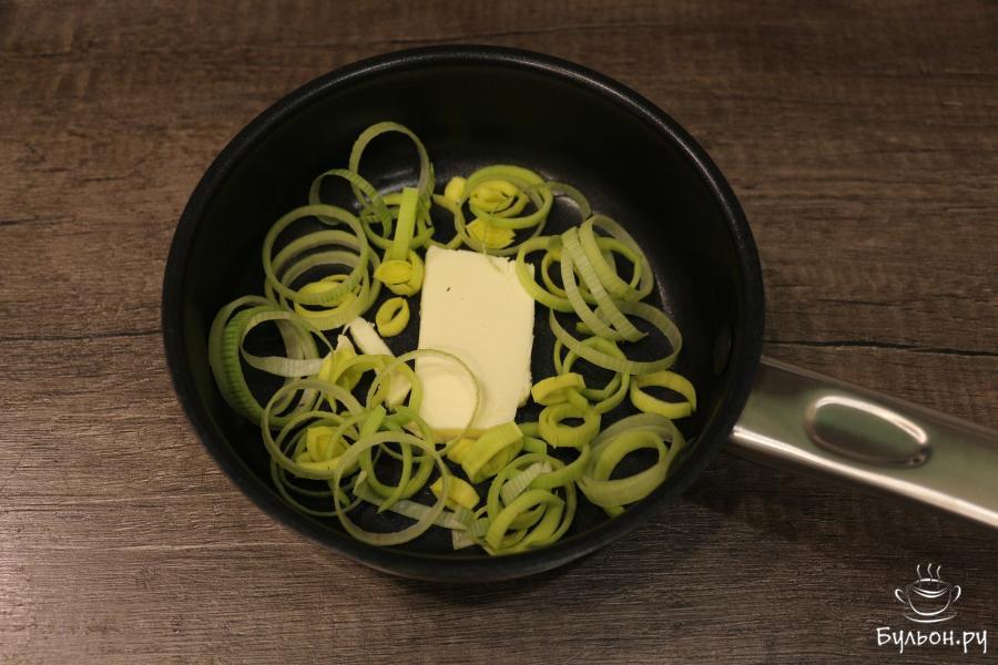 3. В сковородочку выложите сливочное масло и лук-порей. Обжарьте лук в течение 2-3 минут, постоянно помешивая.
