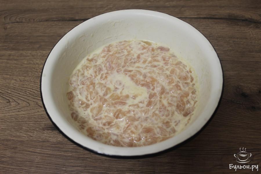 3. Обжарьте на растительном масле куриное филе, формируя полосочки для начинки, их должно получиться 4 шт.
