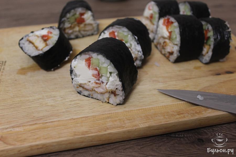 5. Сверните при помощи циновки ролл. Так скрутите еще 3 ролла. Должно получится всего 4 ролла. Каждый ролл нарежьте на 8 частей. Готовые роллы с нежной рубленой курицей подайте к столу.