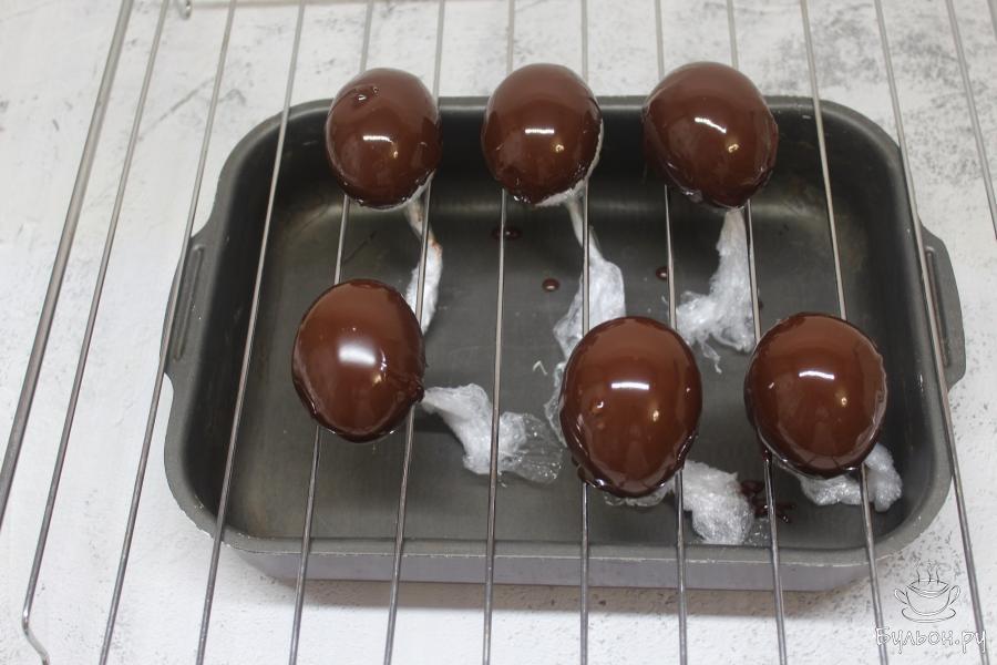 2. Растопите шоколад на паровой бане, добавьте растительное масло и перемешайте. Окуните каждое яйцо наполовину в растопленный шоколад, дайте высохнуть. Повторите процедуру с окунанием яиц в шоколад. Для лучшего эффекта советую убирать шоколадные заготовки в холодильник.