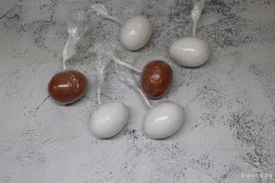 1. Подготовьте яйца. Оберните их пищевой пленкой, скрутите сверху хвостик из пленки и закрепите его скотчем.