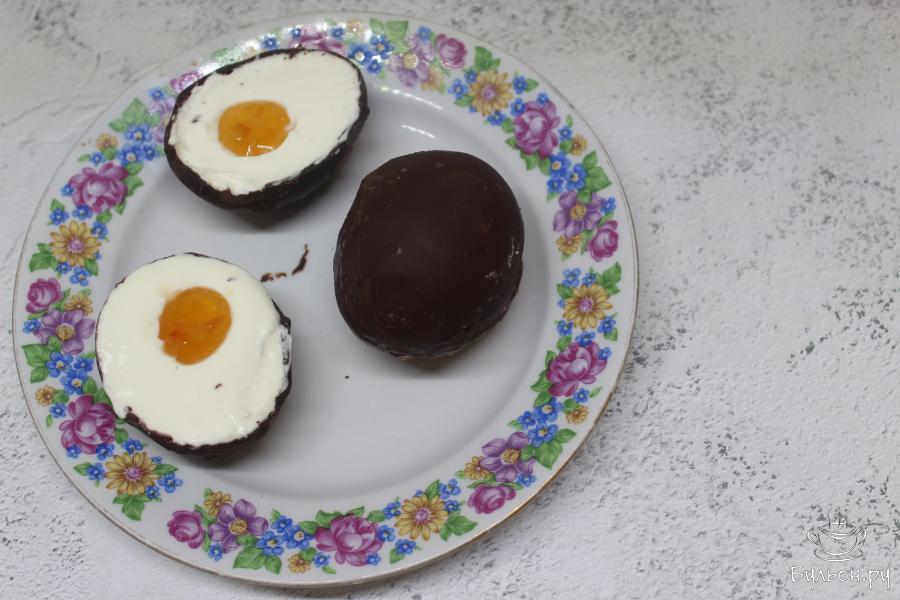 4. Аккуратно освободите шоколадные заготовки. Наполните каждую половинку шоколадных яиц кремом, сделав в середине небольшое углубление. Выложите туда джем.