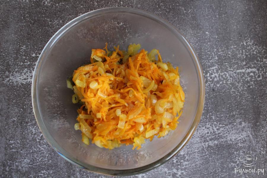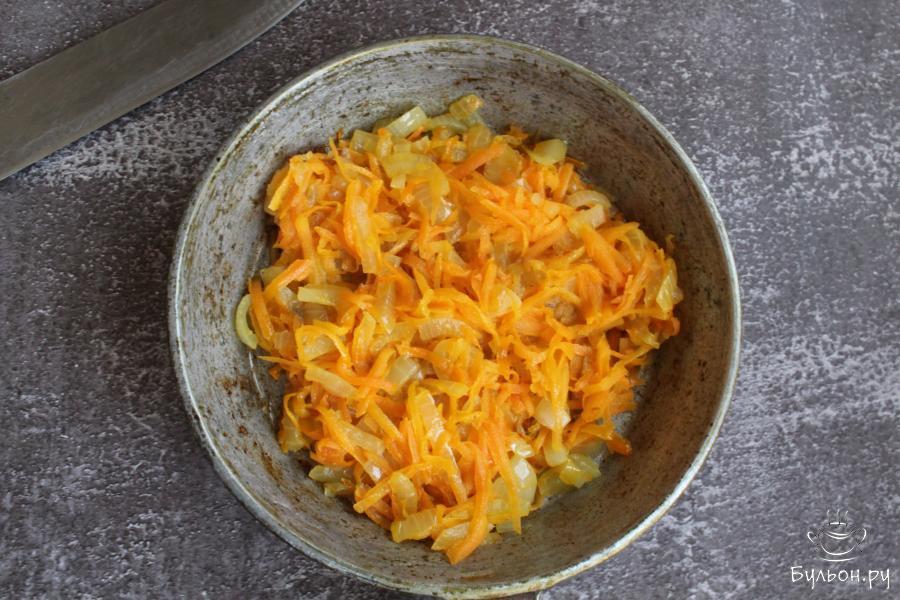 4. Овощи почистить и промыть. Лук нарезать мелко, морковь натереть через крупную терку. Обжарить овощи на сковороде с маслом до мягкости.