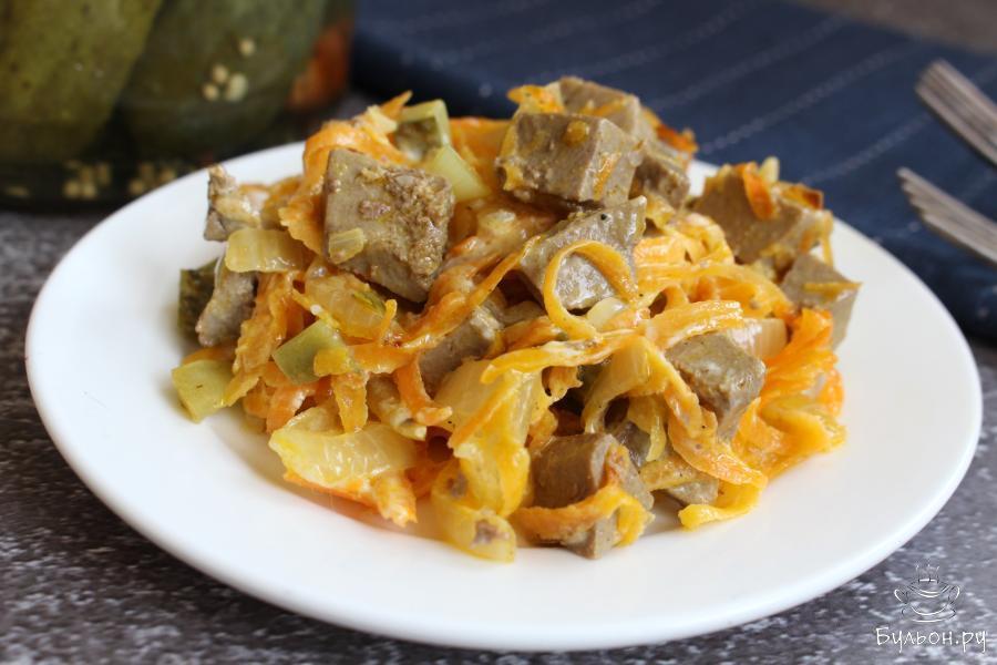Этот салат понравится всем, кто любит блюда с субпродуктами. Салат с говяжьей печенью и маринованными огурцами получается насыщенный, вкусный и сытный, порцией такого салата можно заменить обед или ужин. Вместо майонеза, такой салат можно заправить сметаной или вообще ничем не заправлять. Все варианты нужно попробовать, все они аппетитные. Готовится салат достаточно просто. По желанию в этот салат можно добавить жареные грибы.
