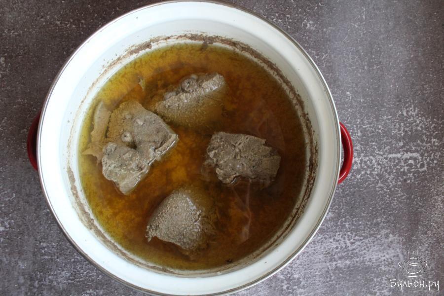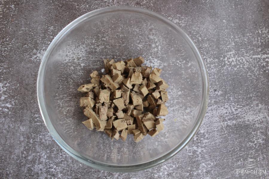 1. Печень почистить от пленок, нарезать крупно, промыть, залить водой и сварить до готовности. Варить 30-35 минут. Воду слить.
