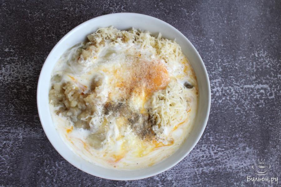 6. Добавить сметанную смесь в чашку к остальным ингредиентам. Добавить соль, перец и мускатный орех. Взбить до однородности миксером или венчиком.