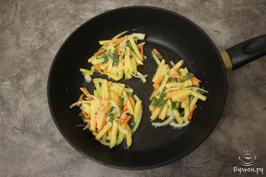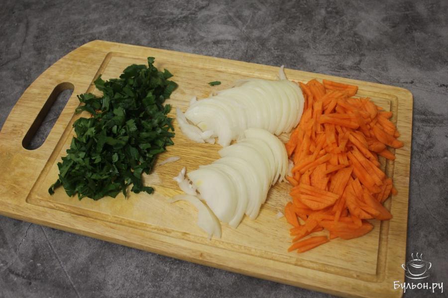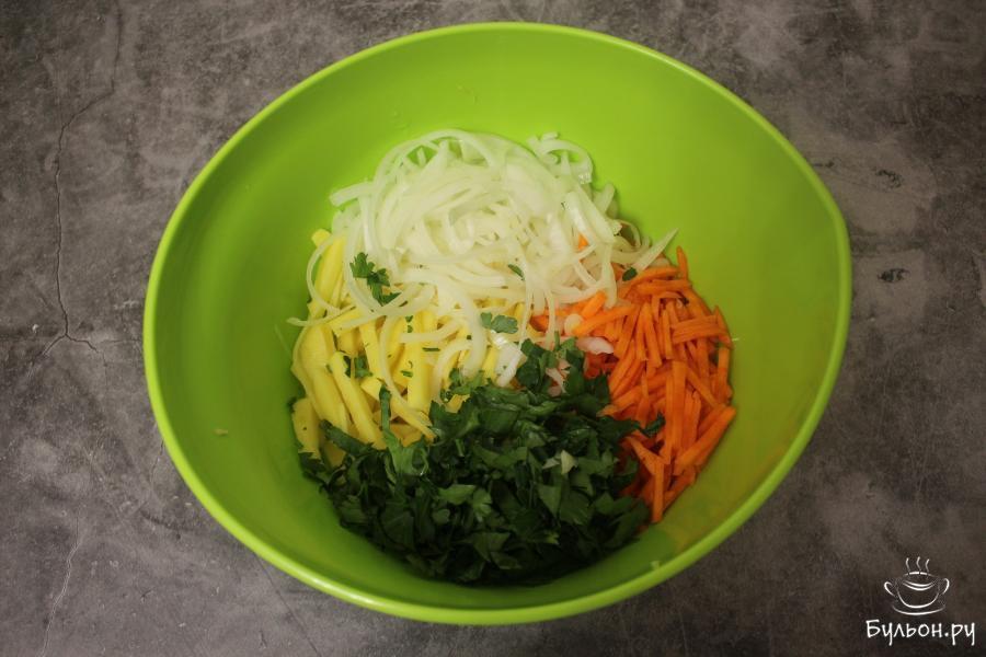 2. Морковь, также с помощью специальной терке, натрите на соломку, но уже более тонкую. Лук порежьте полукольцами. Зелень измельчите.