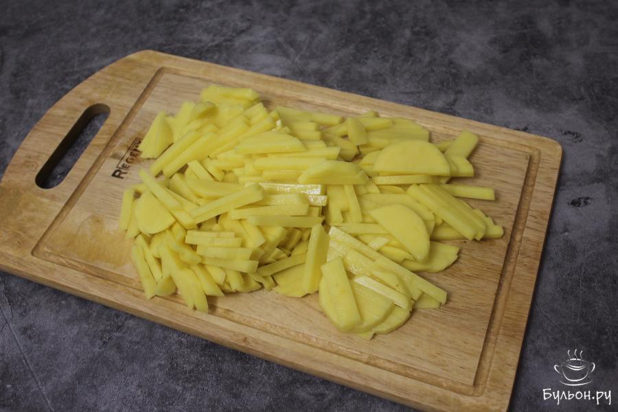 1. Очищенный картофель, с помощью специальной терки, натрите на соломку, либо же просто нарежьте ножом. Переложите в миску, залейте водой и отставьте в сторону.