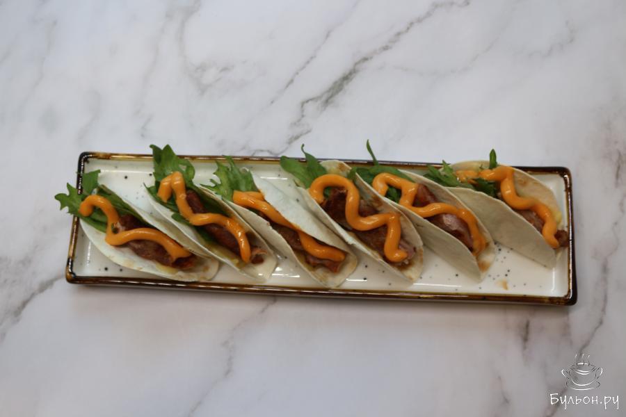 5. Когда сыр расплавился, а лавашики подсушились и сохранили нужную форму, достаньте их из духовки. Лист фриллиса порвите на кусочки, положите их на сыр, затем положите кусочки свинины, сверху украсьте закуску бургерным соусом или, например, соусом барбекю. С ним закуска получается тоже очень вкусной.