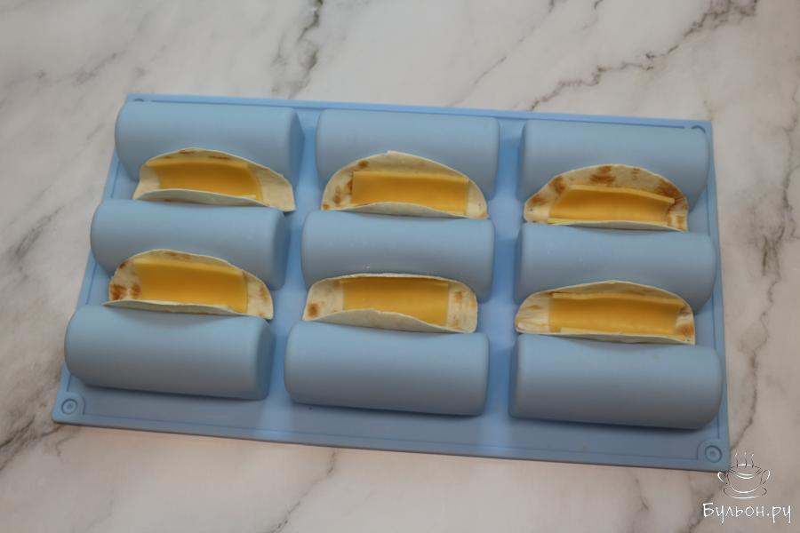 3. Затем используйте форму для запекания кексов. Ее переверните обратной стороной и, сложив пополам кружочки с сыром, установите лавашики в пространство между выступающими ячейками, в которых пекутся кексы. Поставьте их в разогретый до 180 градусов духовой шкаф, готовьте 5 минут.