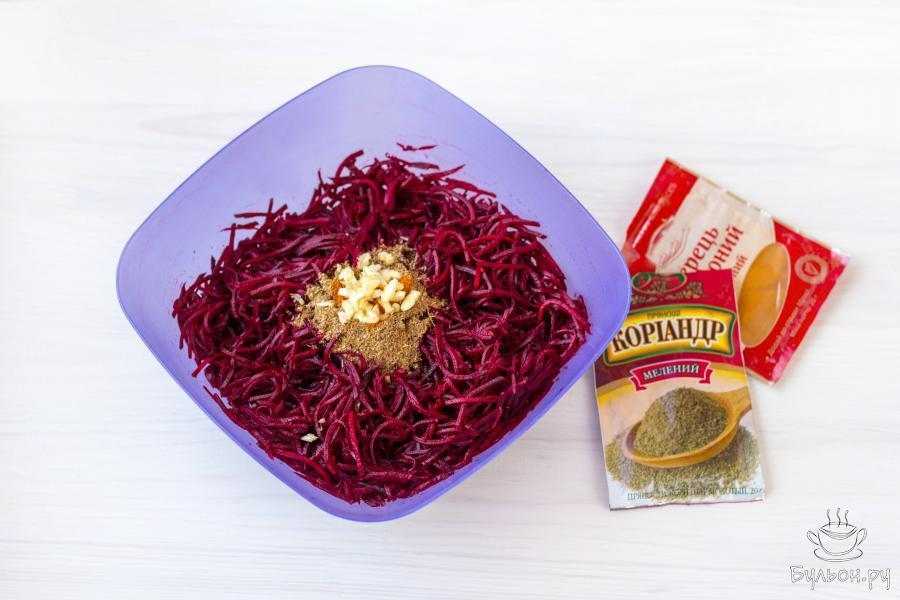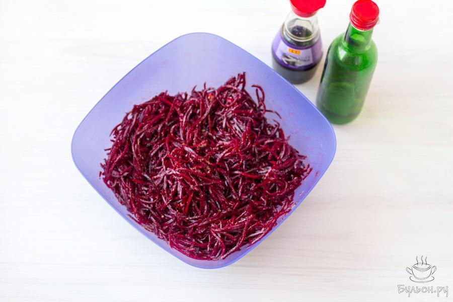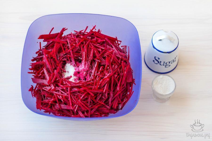 3. Добавьте 1 столовую ложку соли и 1-2 чайные ложки сахара. Хорошо все перемешайте и оставьте закуску на 30 минут, для того чтобы свекла пустила сок.
