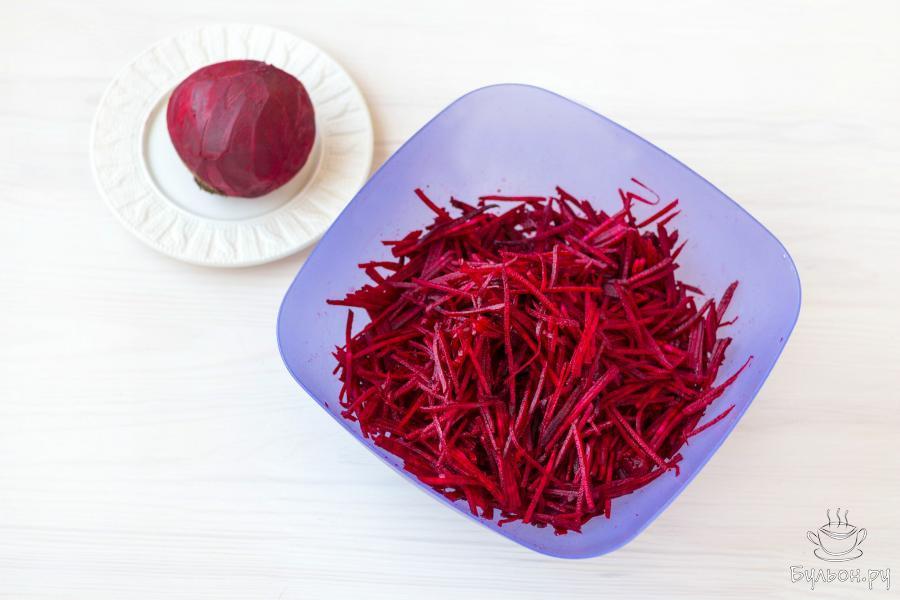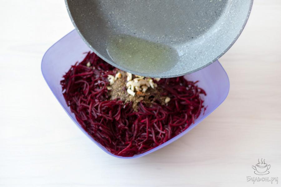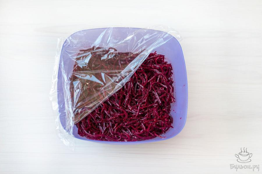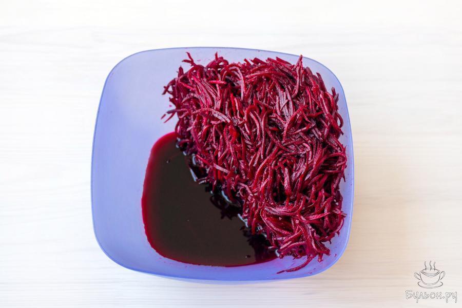 10. Прикройте емкость с закуской крышкой или пищевой пленкой, и поместите в холодильник на несколько часов. Как только свекла охладится - закуску можно подавать к столу, но настоявшись 12-15 часов она станет только вкуснее.