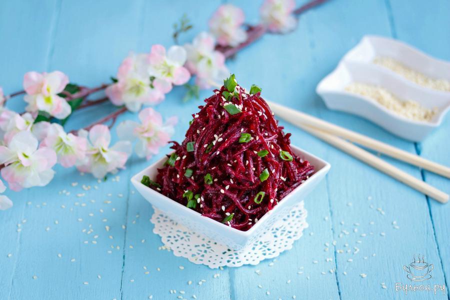 11. Готовую закуску по желанию присыпьте поджаренными семенами кунжута и украсьте щепоткой зеленого лука. Свекла по-корейски готова.