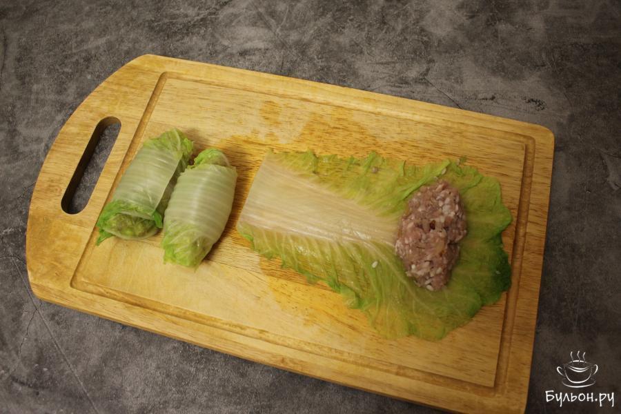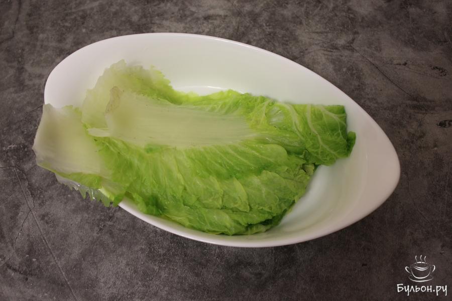 3. Пекинскую капусту разберите на отдельные листы и немного подрежьте основание. В глубокую кастрюлю с кипящей водой выкладывайте по несколько листиков капусты и кипятите по 2 минуты, чтобы листья стали мягкими.