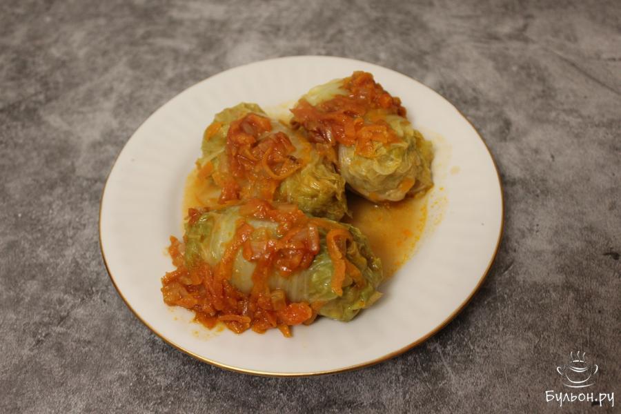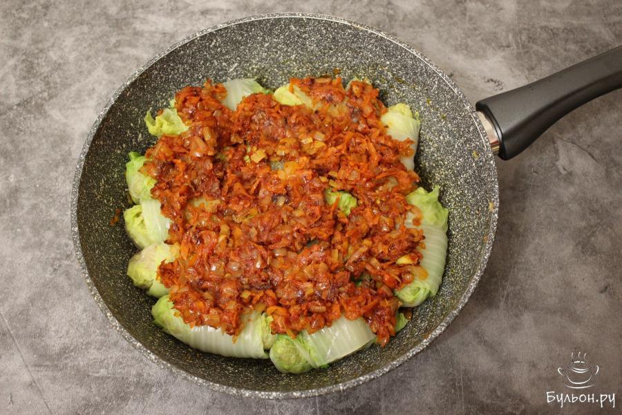 5. На растительном масле обжарьте лук и морковь. Добавьте томатную пасту и еще немного обжарьте. Овощную зажарку выложите на голубцы и залейте кипятком. Тушите голубцы под закрытой крышкой на медленном огне 30-40 минут.