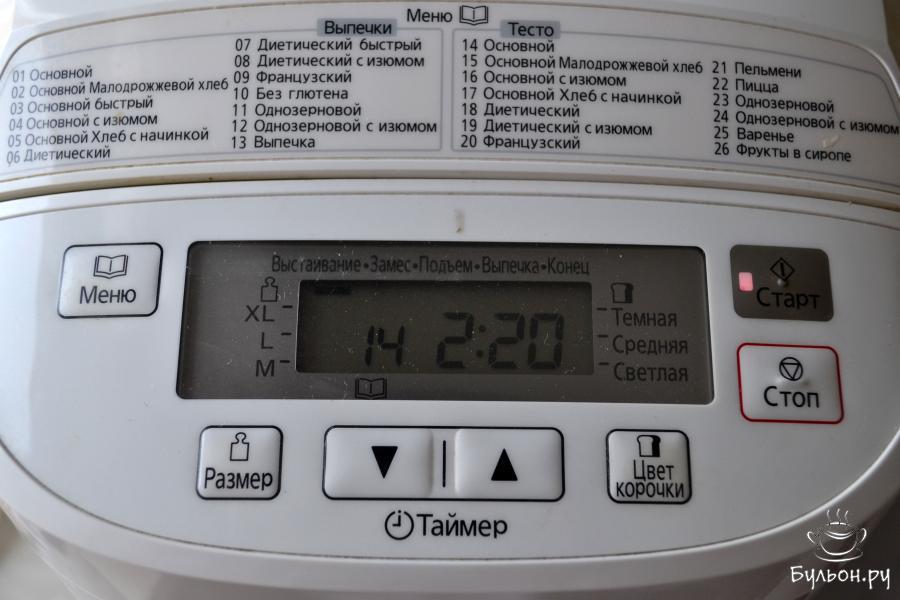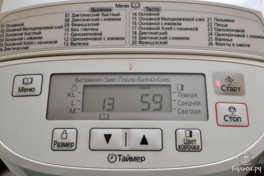 4. Поставьте ведерко в хлебопечь, выставите программу для замеса теста. На моей ХП - это 2 часа 20 минут.