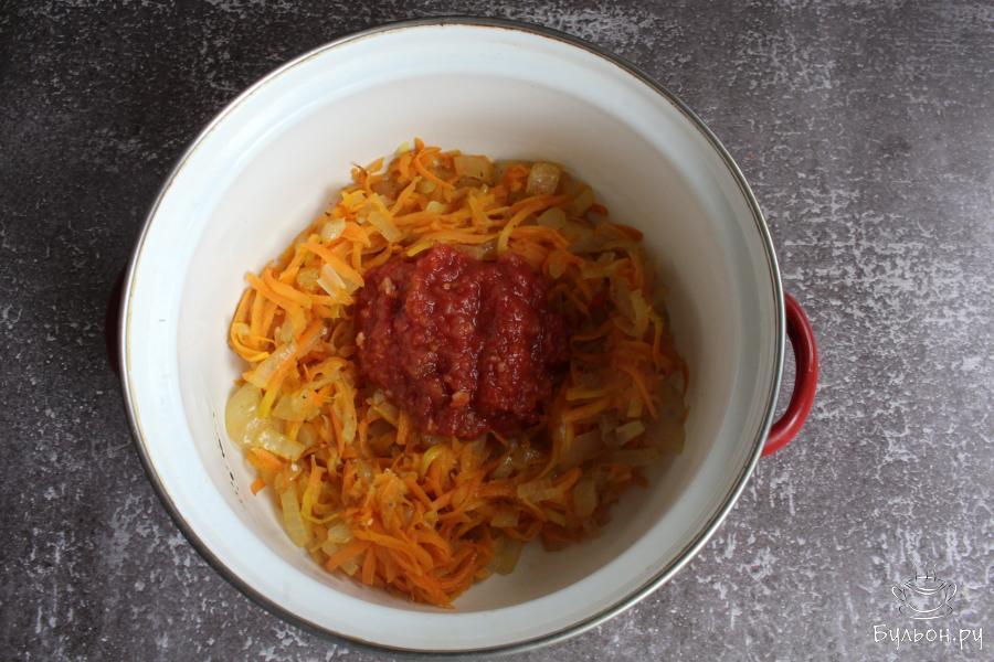 7. Овощи выложить в кастрюлю, добавить томатную пасту или томатный соус, влить бульон. Перемешать овощи, попробовать, если нужно посолить.