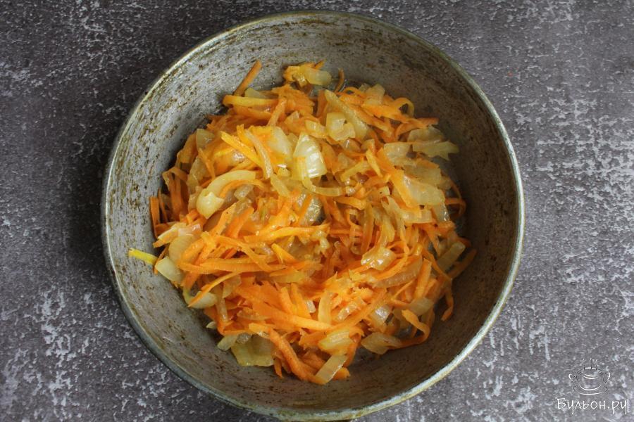4. Лук и морковь почистить, промыть. Лук мелко нарезать, морковь натереть на крупной терке. Обжарить овощи до мягкости на сковороде с 1 ст. л. разогретого масла.