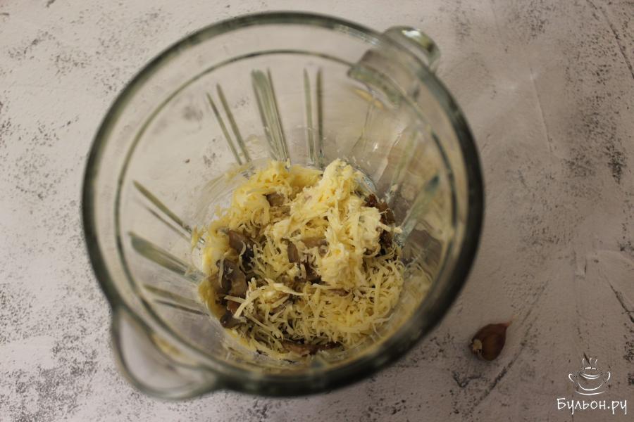 3. Поместите в блендер грибы с луком, влейте сливки, добавьте майонез и натертый на средней терке сыр, приправьте слегка перцем и солью. Измельчите. Добавьте измельченный чеснок и перемешайте.